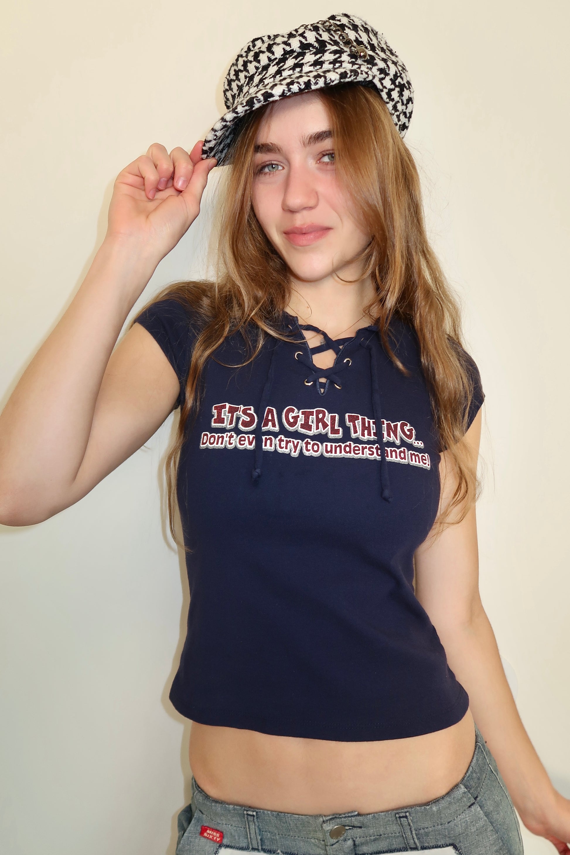 Y2K glittery graphic lace up top. It's a girl thing...don't even try to understand me!